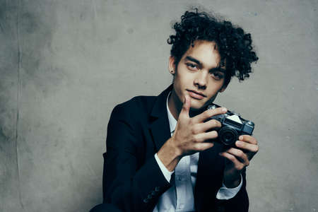 curly-haired man in a classic suit looks at the camera in his hand studio hobby