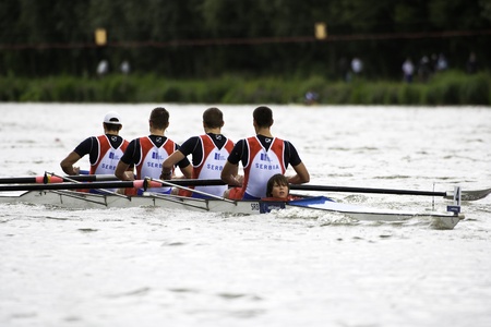 Bosbaan, Amsterdam, Netherlands - 23 July 2011: Serbia's Men's Coxed four wins gold at the world championships rowing under 23 in a world record time of 6:03.01