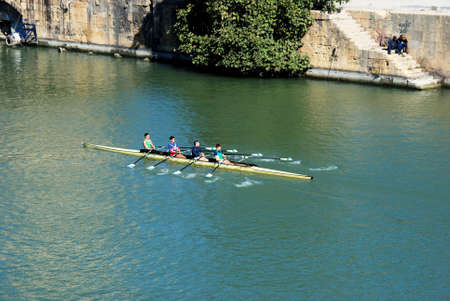 athletes have a workout on the canoe on the Tiber River in Rome