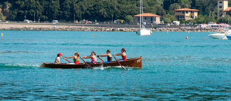 LERICI, LA SPEZIA, LIGURIA, ITALY, JULY 19, 2014: The female rowing team of Lerici trains in the waters of the Gulf of La Spezia for the Palio del Golfo