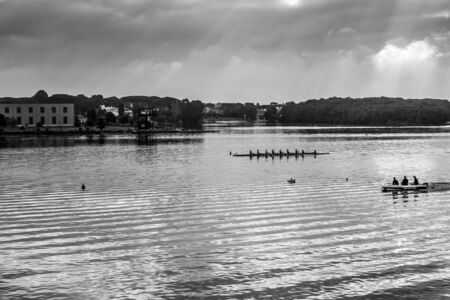 Rowers in eight-oar rowing boats on the tranquil lake