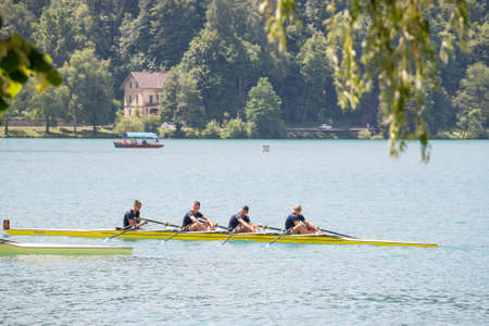 BLED, SLOVENIA - JUNE 13, 2021: Four young male adults, rowers, on a coxed four, a rowing boat, training for rowing for an aviron competition on the Bled lake, in summer, in Slovenia.