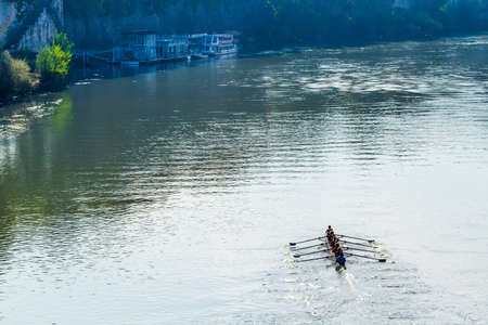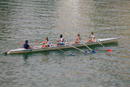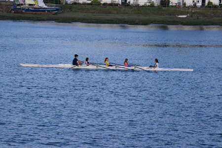 Teenage sportsmen in a boat, rowing on the river Rioni, Poti, Georgia.
