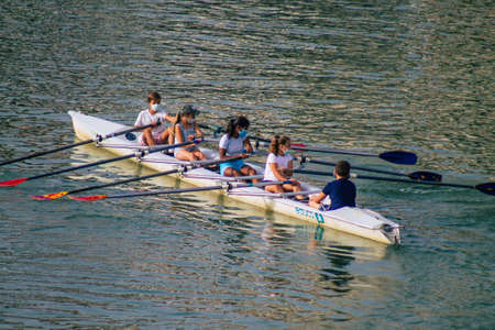 Seville Spain July 23, 2021 Unidentified people rowing on the Guadalquivir river that crosses Seville during the coronavirus pandemic affecting Spain