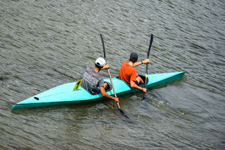 Two young athletes are sailing canoe on river, controlling oars. Active outdoor sports training. top view. back view. copyspace. Chisinau, Moldova - July 2021