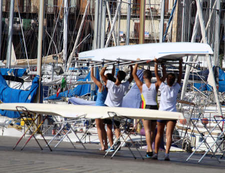 group of young athletes moving a training canoe with arms high along the quay of the port
