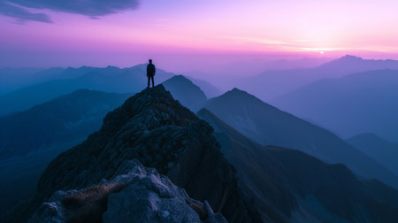 A lone climber standing on a mountain peak at sunrise, capturing breathtaking panoramic views and vibrant colors