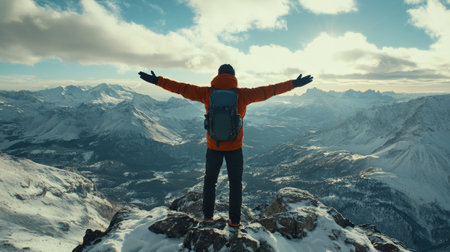 Sunrise triumph: A happy man reaches new heights, standing tall on a mountain summit, embracing the morning glow. Summit serenity: A triumphant man atop a mountain greets the sunrise, a moment of pure joy and accomplishment.