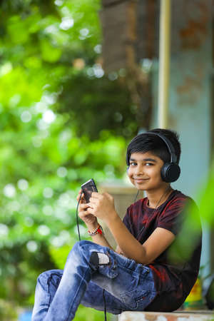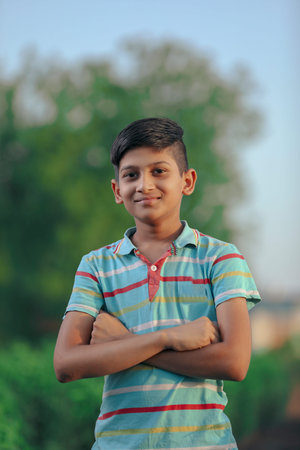 A young asian indian boy looking at the other side in front of natural background with blue check shirt