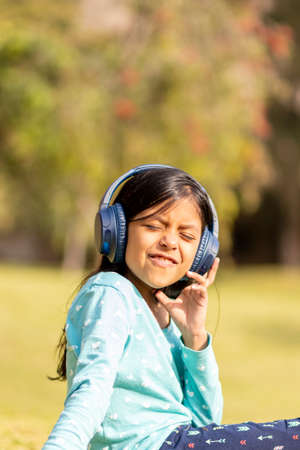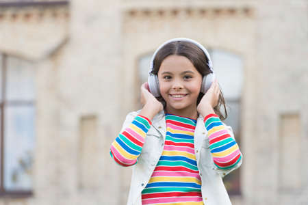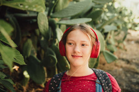 Outdoor portrait of pretty teenage girl, listening music with headphones