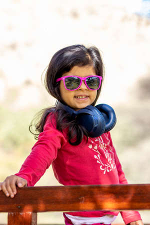 Outdoor portrait of a smiling young female teenager in headphones, looking at camera