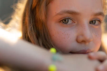 A portrait of a young girl with long bright hair and freckles in sunlight