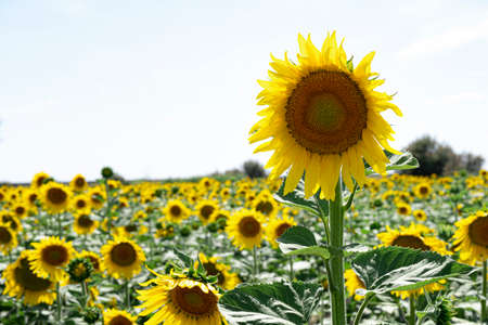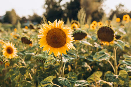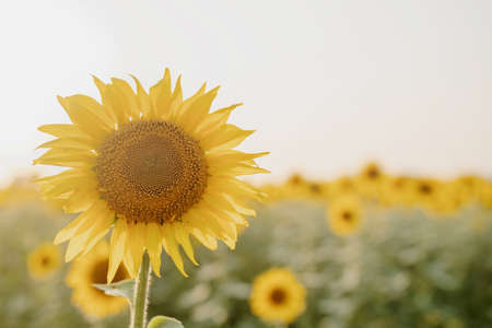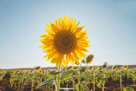 Bright yellow sunflower on big agricultural field with sunset light background, summer nature flower