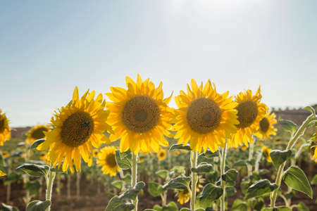 Bright yellow sunflowers growing in the field and sun rays through the eco plant in summer