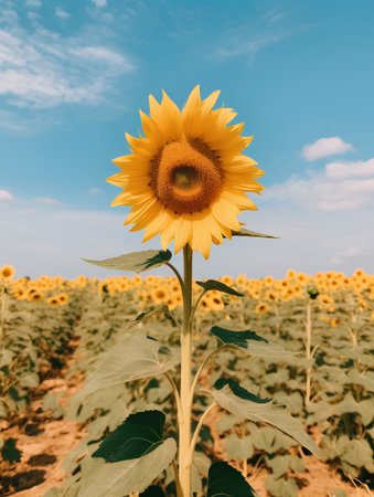 A stunning sunflower stands tall against a bright blue sky adorned with fluffy white clouds, evoking feelings of warmth, beauty, and tranquility in nature.