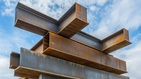 A striking arrangement of industrial steel beams showcases the texture and complexity of construction materials under a vibrant blue sky with fluffy clouds.
