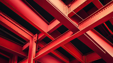 This vibrant image showcases the intricate interplay of red steel beams viewed from below, highlighting modern industrial design with depth and geometric patterns.