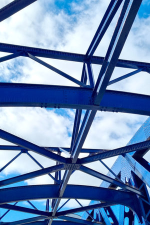 Blue steel beams form the intricate structure of a bridge against a backdrop of vibrant clouds. the architectural design showcases engineering precision, the contrast between the industrial metal and the natural sky.