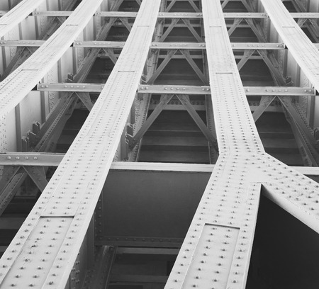 Detail of the steel structure of a bridge. Black and white