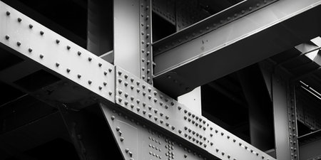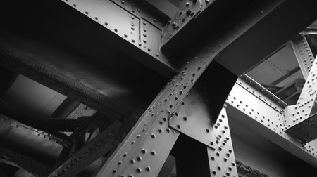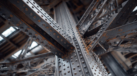 This detailed close-up captures rusty steel beams adorned with rivets, showcasing the rugged beauty of industrial architecture and engineering.
