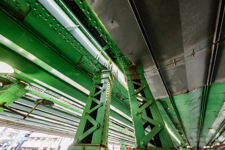 Framework metal arches girder construction Underneath of Blackfriars Bridge. View of Structure and beams under the Curved steel Bridge, Riveted steel beams supporting bridge span, Copy space, Selective focus.