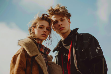 Trendy young man and woman posing in fashionable winter clothing with a clear sky background
