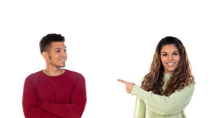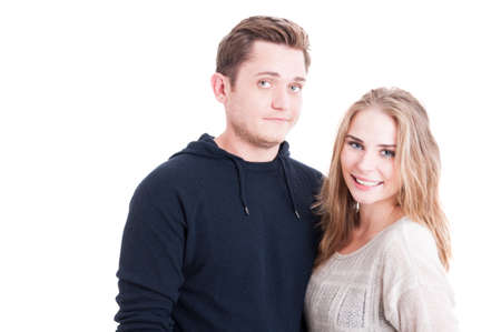 young attractive couple together having fun happy smiling isolated on white background, emotional posing, lifestyle people concept