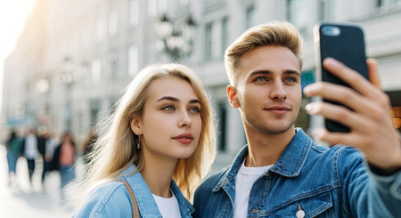 Couple enjoying a sunny day, taking a selfie in a lively urban environment, surrounded by people and city architecture, showcasing happiness and togetherness, AI generated