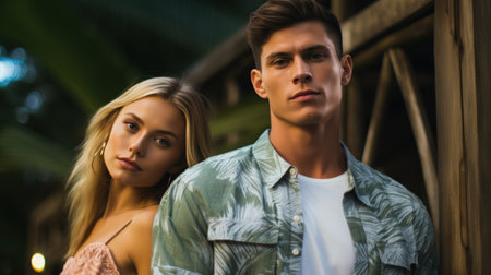 Beautiful couple with model looks, showcasing trendy couple's fashion on their Bali adventures