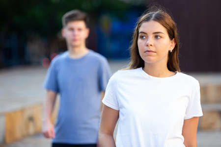Portrait of a beautiful young couple in love. Teenagers Man and woman outdoors