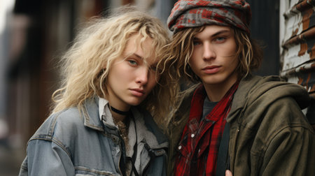 90s fashion revival with a modern twist. Girls in grunge-inspired attire, emphasizing oversized denim, layering, and edgy accessories. A gritty urban backdrop for an authentic representation of this trend.
