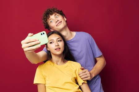 Couple young funny and happy guy and girl posing in studio studio on gray background in casual light clothes. Human emotions, youth, love and lifestyle of caucasian teenagers