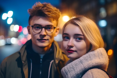 Happy merry male and female lovers of different age feel satisfied after unforgettable night enjoy togetherness stand closely wear casual clothes smile pleasantly Relatio : Generative AI