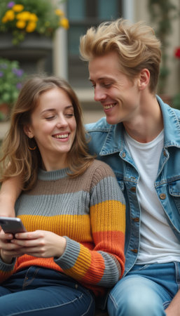 A cheerful young couple sits closely, radiating happiness as they share a light-hearted moment. The woman, dressed in a cozy striped sweater, smiles at her phone while the man, in a denim jacket, gazes at her with affection, creating a warm atmosphere of love and connection