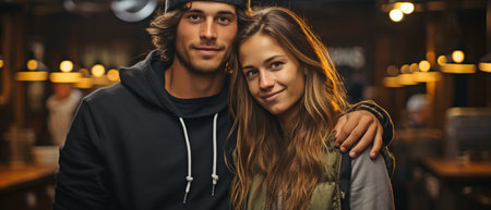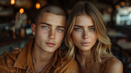 a young pair dressed stylishly seated side by side in a cafe with an industrial design,