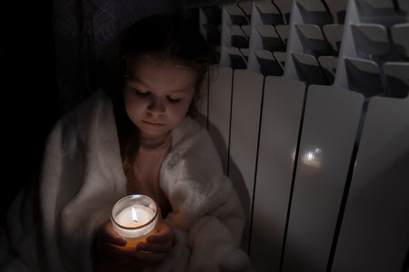A girl in a white plaid holds a candle in a glass cup in her hands against the background of a household radiator. power outage concept. blackout. energy crisis