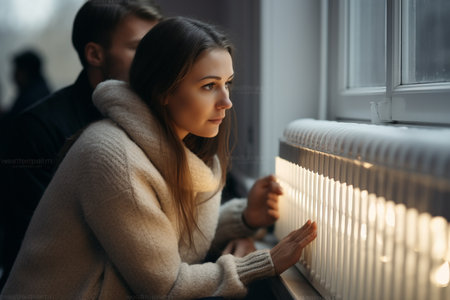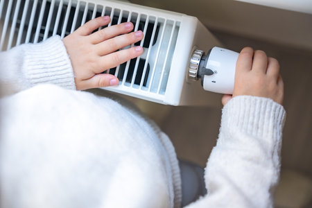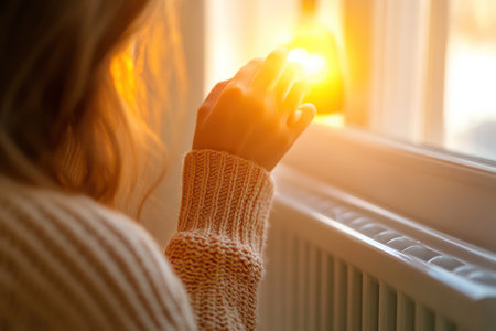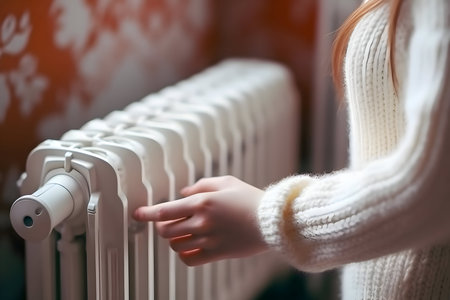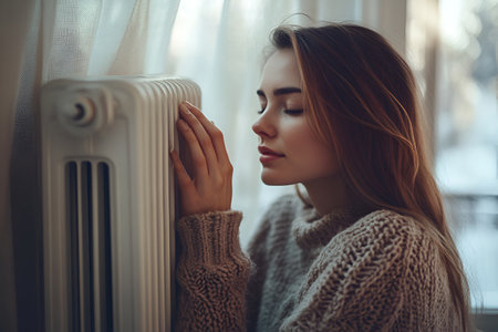 A woman in a cozy sweater warms her hands on a radiator, embracing the comfort of home heating during winter.