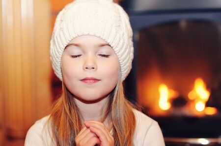 Portrait of child girl in white hat praying by the fireplace with closed eyes
