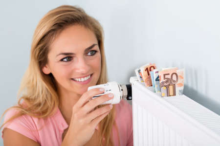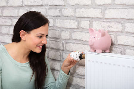 Young Smiling Woman Adjusting Thermostat With Piggy Bank On Radiator At Home