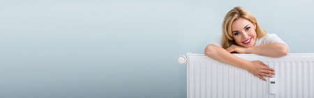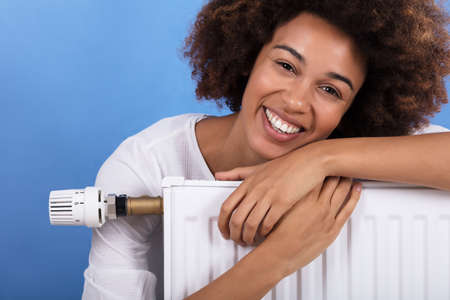 Portrait Of A Smiling Woman Behind The Heating Radiator