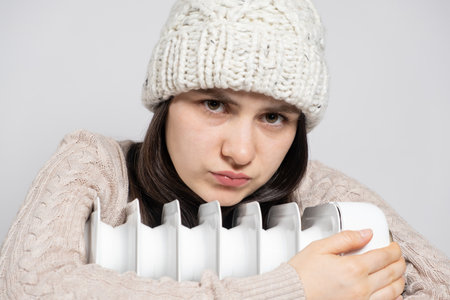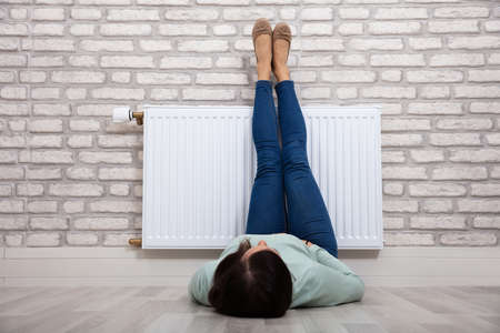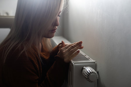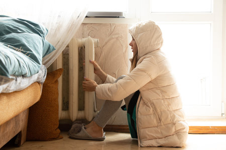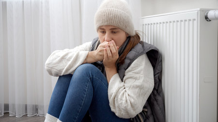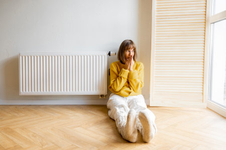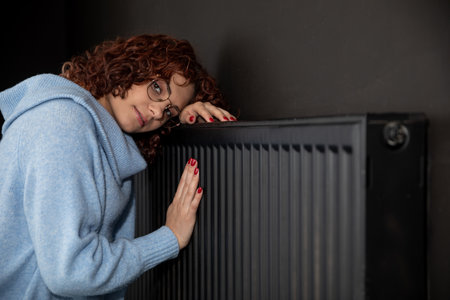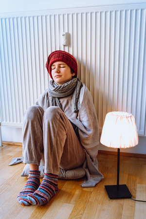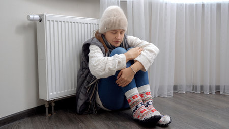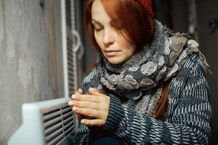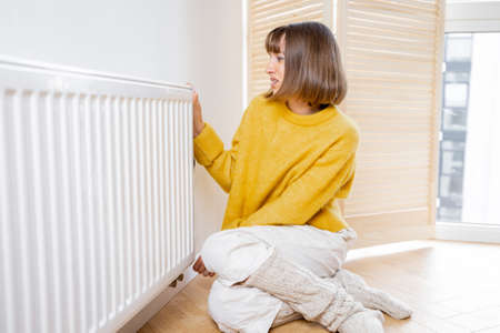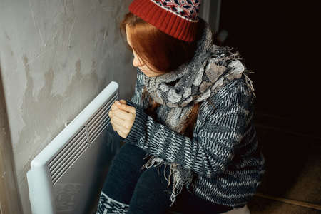 Woman freezing at home, sitting by the cold radiator. Woman with home heating problem feeling cold