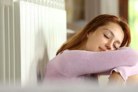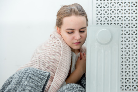 Freezing young woman near a heater