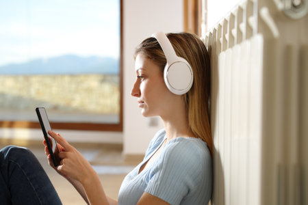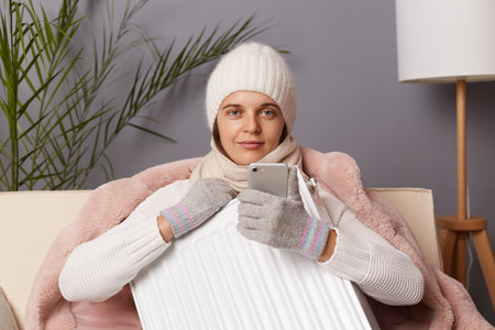 Worried sad woman sits under blanket near heating radiator and use smartphone, Rising costs in private households for gas bill due to inflation and war, Energy crisis