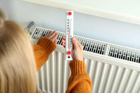 Woman controls room temperature with a thermostat on radiator, feeling cold at home. Concept of saving energy resources and the energy crisis