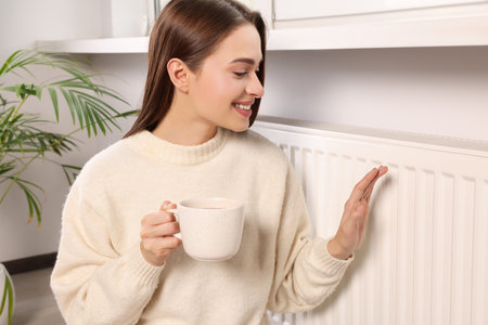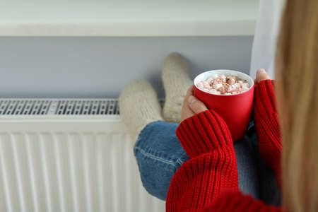 Woman holding cup with hot drink and warming hand on heating radiator indoors