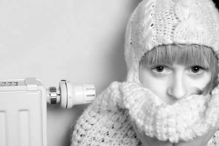 Young woman freezing near a heater. Black and white shot