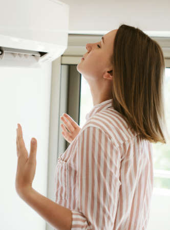 Women dying from the heat standing in front of the air conditioner.