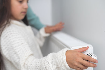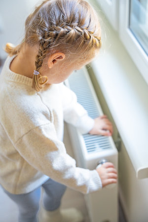 Little girl in warm sweater standing by window turning the battery heating knob and warming up from the heating radiator. Heating in an apartment, at home. High quality photo