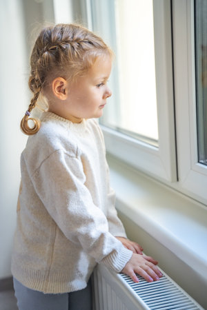 Little girl in warm white sweater standing by window and warming up from the heating radiator. Heating in an apartment, at home. High quality photo