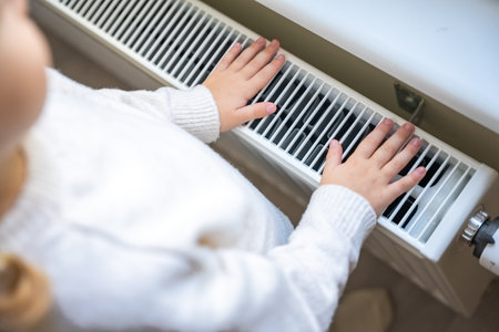Child warming on heating radiator, closeup